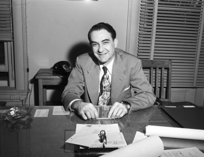 Image shows William Schweitzer seated in office at his desk. Published in the Fort Worth Star-Telegram evening edition, April 21, 1951.