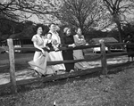Image shows five people watching trial jumps from the fence line at the Ridgles Hunter and Jumper Horse Show. From left to right, Mrs. Earle N. Parker with son, on fence, Whit Parker, Mrs. Pat Wilkirson, Itasco, A. T. Seymour Jr and H. L. McGurk. Unidentified woman on right with notepad. Published in the Fort Worth Star-Telegram morning edition, April 29, 1951.