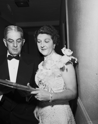 Mrs. Lawrence Tarlton joined her husband Mr. Lawrence Tarlton in admiring the bronze plaque awarded her by the Altrusa Club as "First Lady of Fort Worth for 1952" at a civic award dinner in her honor.