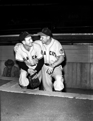 Heroes of Oklahoma City's early showing in Texas League are Pitcher Al Gerheauser, left, who's won four games, and Manager Tommy Tatum, who was player-coach with Cats last year. Two men wearing baseball uniforms smiling at each other. One man is wearing a baseball mit on his hand. Published in Fort Worth Star-Telegram evening edition, April 25, 1951.