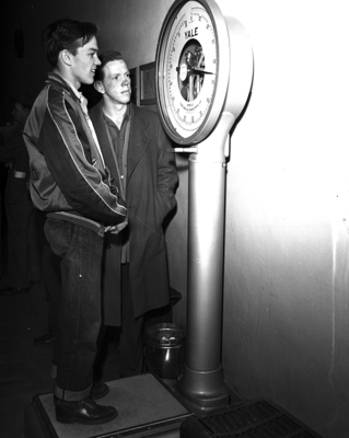 Amarillo light-heavyweight Roy Henry watches teammate Pat McCarthy check his weight for state gloves meet. Published in the Fort Worth Star-Telegram evening edition, February 15, 1950.