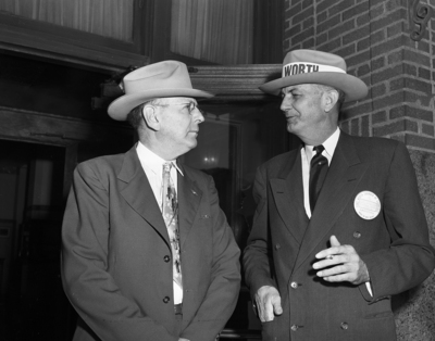 E. P Williams, right, of Fort Worth, is shown talking to Brownwood Mayor A. N. Thomason at the first stop of Operation Howdy's chartered plane, making a three-day tour of West Texas, including trans-Pecos and Big Bend areas. Published in Fort Worth Star-Telegram evening edition April 25, 1951.