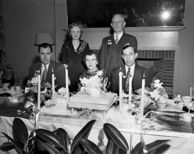 Miss Mary Owen, standing, president of Beta Alpha Rho, with her boss, J. A. Elliot, at the BAR 16th annual bosses banquet. Seated, Miss Dorothy Cadwallader, with her bosses, T. T. Chamberlain, left, and M. L. Hartwig. Published in Fort Worth Star-Telegram morning edition, February 16, 1950.