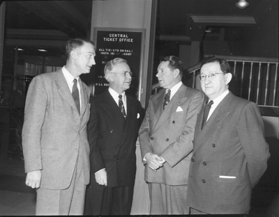 Fort Worth officials of the National Conference of Christians and Jews greeted National Brotherhood Chairman John L. Sullivan. Left to right are Bernard Lunt, Cecil Morgan, Sullivan and Sol Brachman. Published in Fort Worth Star-Telegram evening edition, February 15, 1950.
