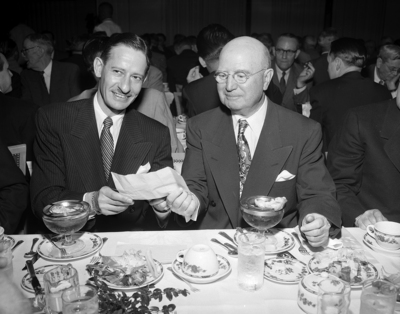 Image shows J. P. Reinhold, left, Chicago, presidential assistant for public relations of Santa Fe System with William Holden, executive vice president of the Fort Worth Chamber of Commerce. They have worked together on several projects to obtain industries for Fort Worth and Central Texas. They are seated at a dining table amongst a crowd. Published in the Fort Worth Star-Telegram evening edition, April 28, 1951.