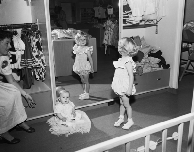 Special Baby Section. Janis Wilborn, daughter of Mr. and mrs. J. D. Wilborn, shown admiring herself in mirror, as brother Paul watches.