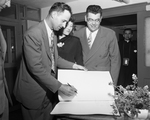 Image shows Judge Glenn W. Thompson, Morton, left, Mrs. Drew S. Clifton and Judge Clifton, Fort Worth, signing a guest registry at Gainesville State School for Girls open house. Judge Clifton, County Court of Law, spoke at the Gainesville schools religious service. Two unidentified men on far left and right. Published in the Fort Worth Star-Telegram morning edition, April 30, 1951.