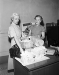 Image shows Mrs. Jenny Langford, city health nurse, left, receiving bundles of surgical dressings from Mrs. Sidney Hill, Tumor Clinic secretary. Dressing distribution is a primary objective of the American Cancer Society. The society's Cancer Crusade to raise $38,500. Published in the Fort Worth Star-Telegram evening edition, May 3, 1951.