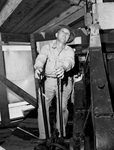 Image shows E. L. Cook, Muskogee, Oklahoma at controls of crane. He is setting controls to lift a five ton girder. Published in the Fort Worth Star-Telegram evening edition, May 3, 1951.