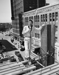 Image shows R. E. Higlin, 3264 Hale, on top of Jesse Jones office building under construction. He is holding a walkie talkie radio broadcasting orders. Published in the Fort Worth Star-Telegram evening edition, May 3, 1951.