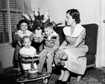 Image shows Mrs. Joseph S. Hullum with her three children, from left to right, Sue Ellen, 5, Edward, 6, and Stephen, 1. They recently moved to Fort Worth from Midland. They are living at 3205 Mitchell Blvd. They are shown seated in a living room. Published in the Fort Worth Star-Telegram evening edition, May 4, 1951.