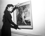 Image shows Norma Jean McClure hanging one of her paintings at Texas Wesleyan College (TWC) Cross Timbers Gallery. The Painting "Trees" was accepted for the 1951 Local Artists' show. Published in the Fort Worth Star-Telegram morning edition May 7, 1951.