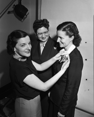 Image shows Misses Betty Donohoo, chairman of badges and programs placing badge on Martha Shaw. In center is Julia Roan, president of Eta Omicron chapter, looking on. They are wearing name badges worn by delegates attending a meeting of Epsilon Sigma Alpha. Published in the Fort Worth Star-Telegram morning edition May 6, 1951.