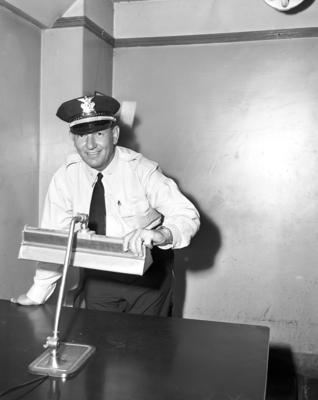 Image shows a bust shot of policeman H. Clay Bishop. He is wearing a policeman uniform, holding a lamp on a table. Published in the Fort Worth Star-Telegram morning edition, May 4, 1951.