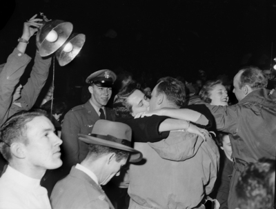 Nine crewmen were brought to Carswell Air Base. Their B-36 had trouble over Queen Charlotte Sound. Embraces such as this were many and long at Carswell Air Base as survivors of a stricken B-36 reached home. At left are Lieutenant Ernest O. Cox and Mrs. Cox and at right, Captain Harold L. Barry and Mrs. Barry. Barry was the plane commander and pilot. The men are welcomed with hugs and kisses from their wives. Published in Fort Worth Star-Telegram morning edition, February 18, 1950.