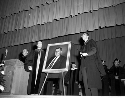 Image shows Southwestern Baptist Theological Seminary unveiling portrait. 262 graduates of Southwestern Baptist Theological Seminary presented a portrait of Dr. W. T. Conner to the seminary. From left to right, Dr. Charles Trentham and Professor James Leo Garrett, standing beside portrait on stage, wearing ceremonial attire. Unidentified person speaking at podium and three unidentified people in background. Published in the Fort Worth Star-Telegram morning edition, May 5, 1951.