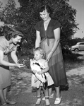 Image shows two year old Cheryl Wolfe, center, holding duck next to her mother, Mrs. H. C. Wolfe Jr. of Rt 12, wanting to exchange the duck for antique brass candlesticks to Mrs. William,Watt, right, Saginaw at annual Tarrant Country Home Demonstration Club "Swap Day" in Rockwood Park. Published in the Fort Worth Star-Telegram evening edition May 5, 1951.
