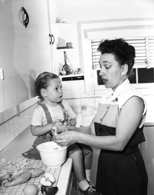 Image shows Mrs. Carolyn Morrell Abney preparing salad in kitchen with her 3 year old daughter, Beth Abney. Beth Abney is seated on counterspace next to bowl and vegetables. She is part of Marshall, Texas housewives defying to pay social security taxes on domestic employees, and seek to repeal what they call un-constitutional law . Mrs. Abney is president of Marshall Woman's Club and president of South Marshall Parent Teacher Association (P-TA). She also teaches at First Baptist Sunday school and is a sponsor of a sorority.