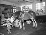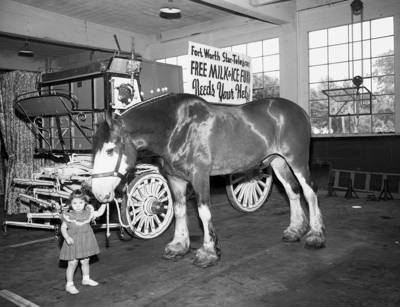 Image shows Cynthia Meek, 2, posed with Craigie, 2,195 pound Clydesdale. Clydesdale are reported to be the largest horses in the United States. Craigie is a member of a six horse hitch quartered in an automobile display room. Published in the Fort Worth Star-Telegram morning edition, May 6, 1951.