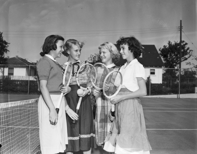 Lenora Waller, 11, and Linda Lawrence, 12, North Hi Mount are all smiles facing opponents Janice Wolfenden, 12, and Sue Springer, 12, of Alice Carlson before first round elementary net match Janice and Sue won from their visitors, 4-3, 3-4, 4-1, to gain simi-finals. Published in Fort Worth Star-Telegram evening edition, May 8, 1951. Four teenage girls holding tennis rackets.