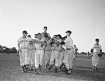 Big Bob McDaniel gets a big left from his joyful North Side baseball mates after twirling a one-hitter against Arlington Heights to give the Steers a 12-1 victory and a championship in the 5-AA baseball race. Published in Fort Worth Star-Telegram evening May 9, 1951.