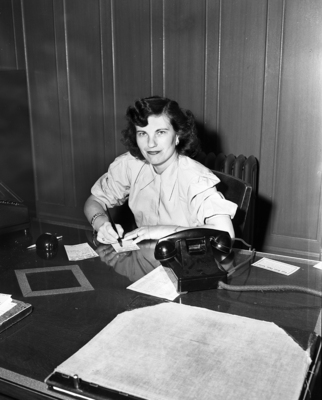 This image was published in the Star-Telegram Junior. It shows Star-Telegram employee Orlena Bowels, sitting behind a desk, writing on a piece of paper. She is looking toward the camera. Published in May, 1951.