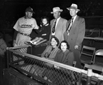 Manager Harry Craft of the Beaumont Roughnecks visited with homefolk from Throckmorton at La Grave Field. Brother Tom Craft and wife are at right, accompanied by daughter, Addibeth, and neighbors, Mr. and Mrs. Jim Bob Daw. Published in Fort Worth Star-Telegram evening edition, May 9, 1951.
