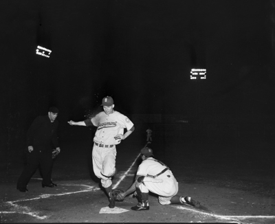 Beaumont's Marty Carlson is tagged out at the plate by Catcher Bobby Bragen in third inning of tilt at La Grave Field. Bragen took throw from Center Fielder Gene Cimoli. A man running over a base plate wearing a baseball hat and uniform. Another Baseball man wearing uniform and backwards hat kneeling touching the other man's foot with his mit. Published in Fort Worth Star-Telegram morning edition, May 9, 1951.
