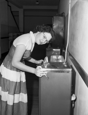 Image shows Mrs. Margaret Stevenson at water fountain. She and the Fort Worth Public Schools are in a dispute over married teenagers attending high school. Published in the Fort Worth Star-Telegram evening edition, May 8, 1951.