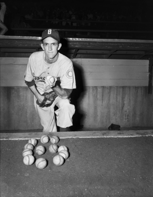 Beaumont's Harry Schaeffer has lost only two games in eight attempts this season. A man wearing a baseball cap and uniform kneeling on one knee with his left hand in a right hand mit. Baseballs are on the ground in front of him. Published in Fort Worth Star-Telegram morning edition, May 13, 1951.