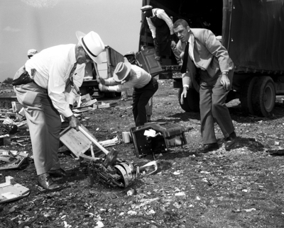 Image shows Sheriff's deputy J. V. Green, Chief Deputy A. B. Carter and Assistant District Attorney S. G. John Roe Jr. destroying slot machines. They are destroying the slot machines with sledgehammers. Three unidentified men are unloading slot machines from trucks. Published in the Fort Worth Star-Telegram morning edition, May 10, 1951.