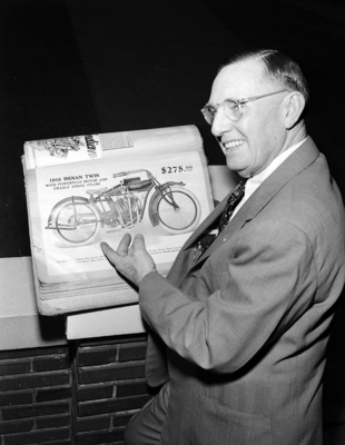 Image shows Captain Henry B. Lewis holding and pointing at a motorcycle pamphlet. Published in the Fort Worth Star-Telegram morning edition, May 10, 1951.