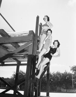 Misses Terry Stoner, 611 West 4th; Marian Johnston, TCU student from Dallas, and Nina Shaw, 3908 Avenue L. and also a TCU student, demonstrate on the Forest Park swimming pool tower that they are ready for the opening of swim season at the pool Saturday.