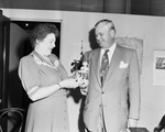 Mrs. Fay Hubbard of 108 Crestwood Drive receives the Community Chest's first "Oscar," presented by Clay Berry. She has contributed to the chest monthly for nine years.