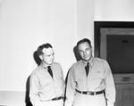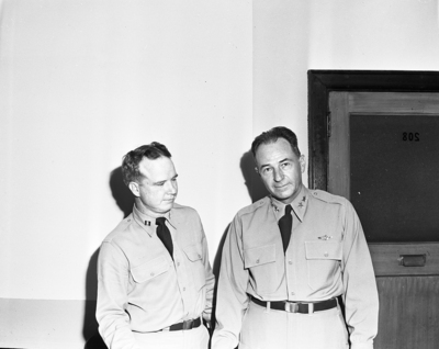 Major General Warren R. Carter, right, who has assumed command at the new Waco headquarters of the Flying Training Air Force, confers during a news conference with Captain Sanky Trimble, former San Angelo and Associated Press newspaperman who is now on the FTAF public information staff.