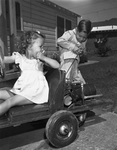 Won't it start? One of life's darkest moments - David Moore, 5-year-old son of Mr. and Mrs. James L. Moore, couldn't get his "hotrod" started when he attempted to take his cousin, Donna Louise Rogers, 4-year-old daughter of Ruth Rogers, 936 East Powell, for a ride. David's father built the small car in his spare time in a shop in his garage. The body of the vehicle, about five feet long and two feet wide, is constructed mainly of plywood with a metal hood. It is powered by a Briggs-Stratton motor which is geared down to about five miles per hour. Due to the dubious legality of operating such a vehicle on the streets of Fort Worth, the Moore's have had constructed a circular sidewalk around their home at 1600 Avenue East, on which the car can be ridden by the children without danger to themselves or others.