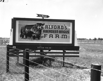 Image shows an outdoor advertising sign of Alford's Aberdeen Angus Farm. On the sign is an image of a Aberdeen Angus cow. The sign marks the entrance to the registered Angus farm operated by the president of the Texas Aberdeen Angus Association. Published in the Fort Worth Star-Telegram June 1951.