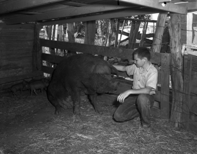 Image shows Glen Burns crouched, showing his registered Duroc sow. The Duroc pig is part of Glen Burns 4- H Club project. In the background there is three Duroc piglets. Published in the Fort Worth Star-Telegram June 1951.