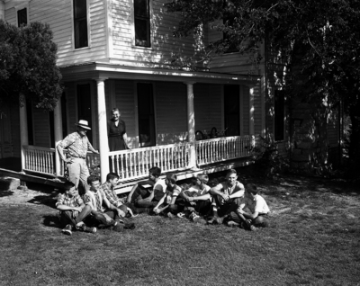 Image shows Roy Watson, left, presiding at the front yard meeting of the eight boys that live at his boys ranch near Thorp Spring. On the porch is Mrs. Gladys Farrington, widowed mother of two of the boys who cooks and keeps the house. From left to right, Kenneth Burns, Billy Burns, Jimmy Farrington, Robert McMurray, Kenneth Farrington, Bobby McSpadden, Milton McSpadden and Glenn Burns. Published in the Fort Worth Star-Telegram June 1951.