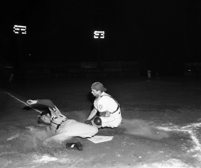 Bill Henry of Shreveport, who pitched his team to 3-2 victory over the Cats here, batted in one run with a double then dashed for home on a single by Grant Dunlap. Norm Postolese, Cat right fielder, fired the ball to the plate. Manager-Catcher Bobby Bragan tagged Henry out. A man in baseball uniform sliding on the ground with his mouth open. A man is stringing his leg near him with arm going down behind the other man. Published in Fort Worth Star-Telegram evening edition, May 12, 1951.