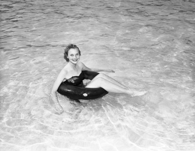 Miss Illene Cardwell of 711 S. Jennings, left, opened the 1951 swimming season at Forest Park pool Saturday by paddling around in a rubber tube.