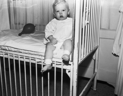 Image of Rue Jones, son of Mr. and Mrs. Norvall Jones. Rue is seated in a crib, he has leukemia.