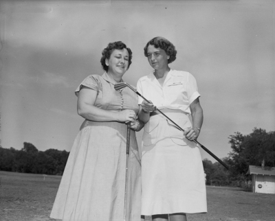 Mrs. H. T. Barr, left, and Mrs. E. G. Brown are two of the favorites in the Sycamore Handicap meet. Mrs. Barr won medal honors. Published in Fort Worth Star-Telegram morning edition, May 13, 1951.