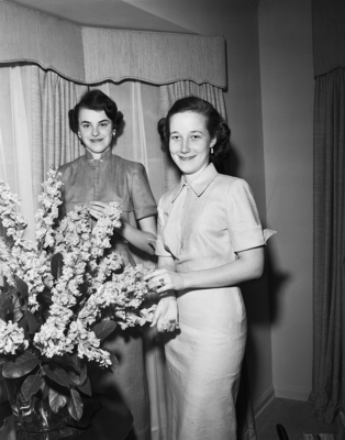 Image shows two recent high-school graduates, Misses Alice Frederick, left, and Angela Colvin, right. This photo was taken during a party held to celebrate the young women's achievement. Published in the morning edition, May 20, 1951.