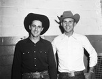 National Intercollegiate Rodeo winners, Maxie Overstreet, left, bull riding champion, and F. C. Stover, top calf-roper. They are wearing shirts, belts, trousers and cowboy hats.