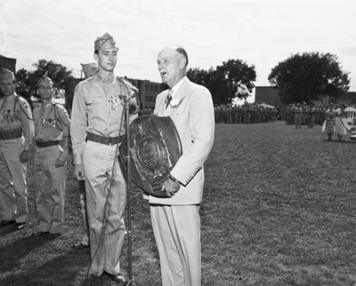 Dr. E. H. Hereford, right, accepts the William Randolph Hearst plaque Sunday at Arlington State College for the school's rifle team winning third place in the 4th Army area rifle matches. Cadet Colonel Tom A. Stevenson, left, of 4806 Panola, Fort Worth, made the presentation at special Mothers Day parade of the ASC Corps.