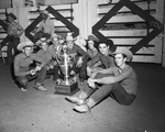 Members of the Sul Ross rodeo team pose with the National Intercollegiate Rodeo Association team trophy which they won for the third consecutive year here Sunday night. They now retain permanent possession of the trophy. From left to right are, Gene Newman, Clay Cade, Coach E. E. Turner, Harley May, Jimmy Dyer, Johnny Ackel and Ross May.