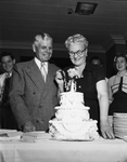 The new Mrs. George Edward Leberman cuts their wedding cake as the groom beams. The bride was the former Mrs. Rose Sarah Gilbreath. They were married on the groom's 77th birthday.