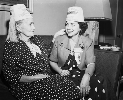 Mrs. Grace M. Zitzman, left, grand high priestess of the Ladies Oriental Shrine of North America 30 years ago, adjusts the cap showing her daughter, Mrs. Dorothy E. Keen, holds the same top post now. Both are from Pittsburgh and are here for the Grand Council of women Shriners.