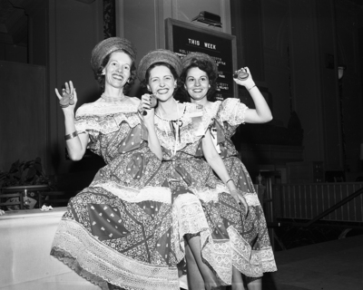 Border Belles - Three representatives from El Paso's El Minya Court tried their Juarez castanets Tuesday at Hotel Texas. The border city court will participate in a ceremonial Tuesday night at Will Rogers Memorial Coliseum along with Fort Worth's Nycana Court. Left to right the El Pasoans are Mrs. Dixie Horst, Mrs. Peggy Gorman and Mrs. Dorothy Glass. Ladies Oriental Shrine (convention).